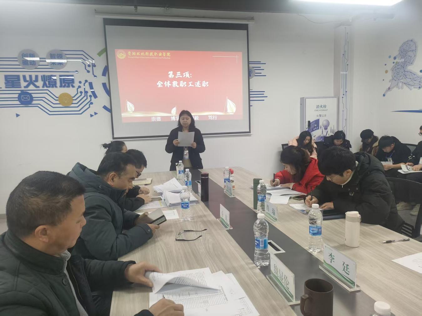 在全体教职工述职环节,与会教职工依次登台,围绕年度教学任务完成、科研项目推进、学生管理服务、团队协作贡献等方面内容,全面梳理了个人年度工作成果,深入剖析了工作中存在的问题与不足,并结合学院发展规划和个人职业成长,明确了下一年度的工作目标与具体举措。述职过程中,大家实事求是、坦诚交流,既展示了履职尽责的扎实成效,也展现了求真务实的工作作风。通过相互述职交流,教职工之间增进了了解、借鉴了经验、凝聚了共识,达到了“以述促学、以述促改、以述促干”的良好效果。