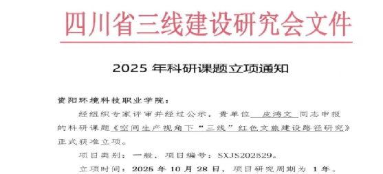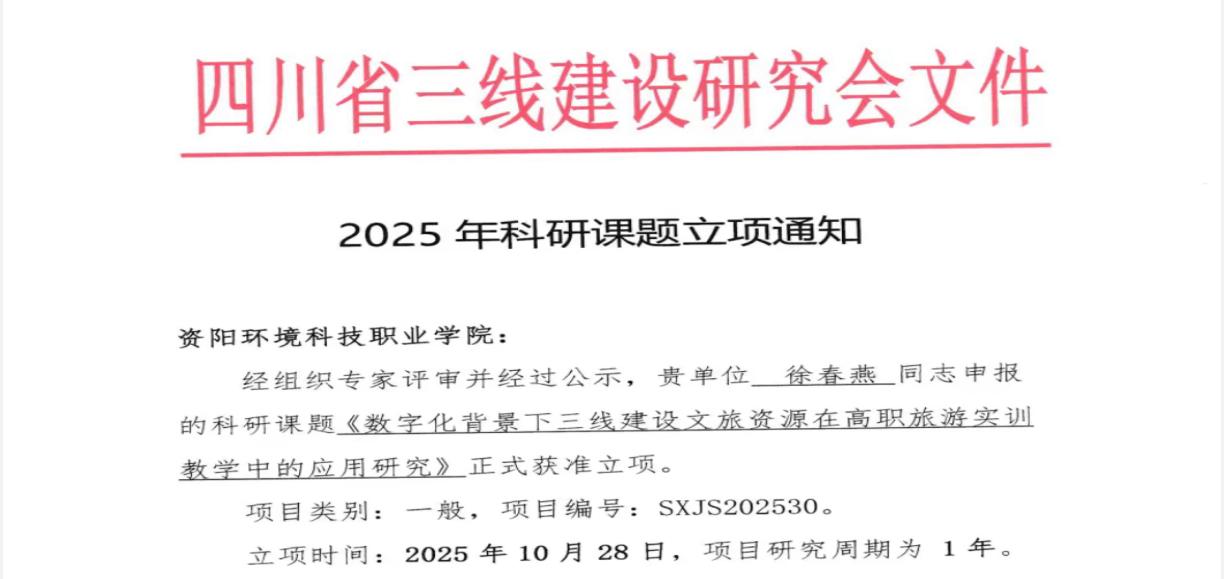近日,四川省三线建设研究会正式公布了2025年度科研课题立项结果。数字经济与管理学院旅游管理专业教师徐春燕主持的《数字化背景下三线建设文旅资源在高职旅游实训教学中的应用研究》与皮鸿文主持的《空间生产视角下“三线”红色文旅建设路径研究》两项课题,经过激烈角逐,成功获得立项。